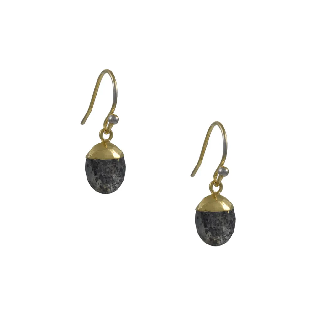 These pretty little earrings feature a facted oval of sparkly grey quartz capped with gold plated brass and suspended from simeple French wire hooks. Handcrafted in New York City.