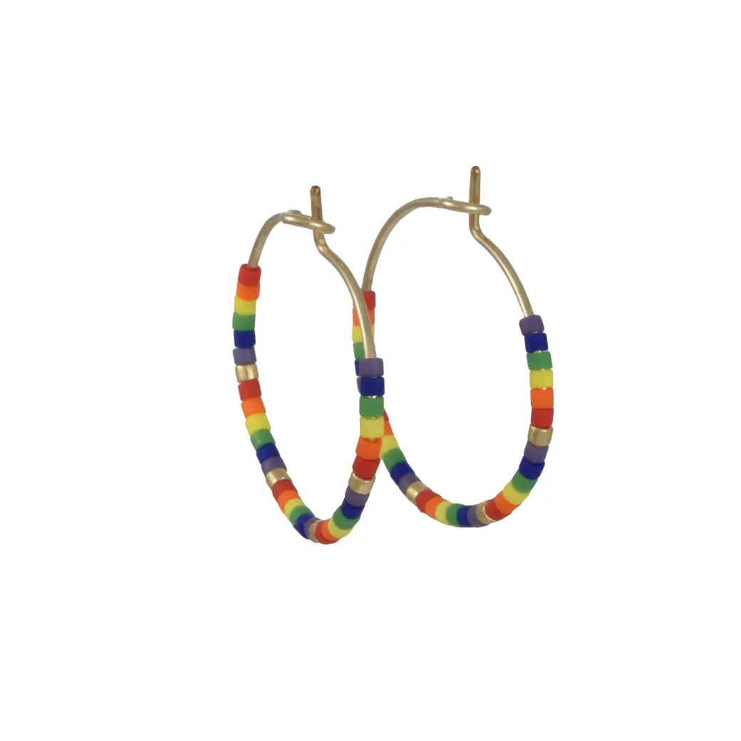 Show your pride everyday with these sweet seed bead earrings. Lightweight hoops, with a pop of color.