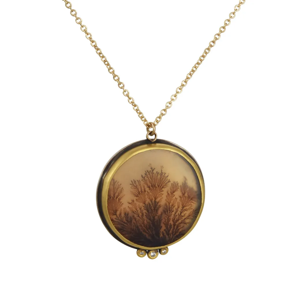 This heirloom quality necklace features a beautiful dendritic agate bezel set in 22k with three tiny diamonds accenting the bottom. Handmade in Northampton Mass.