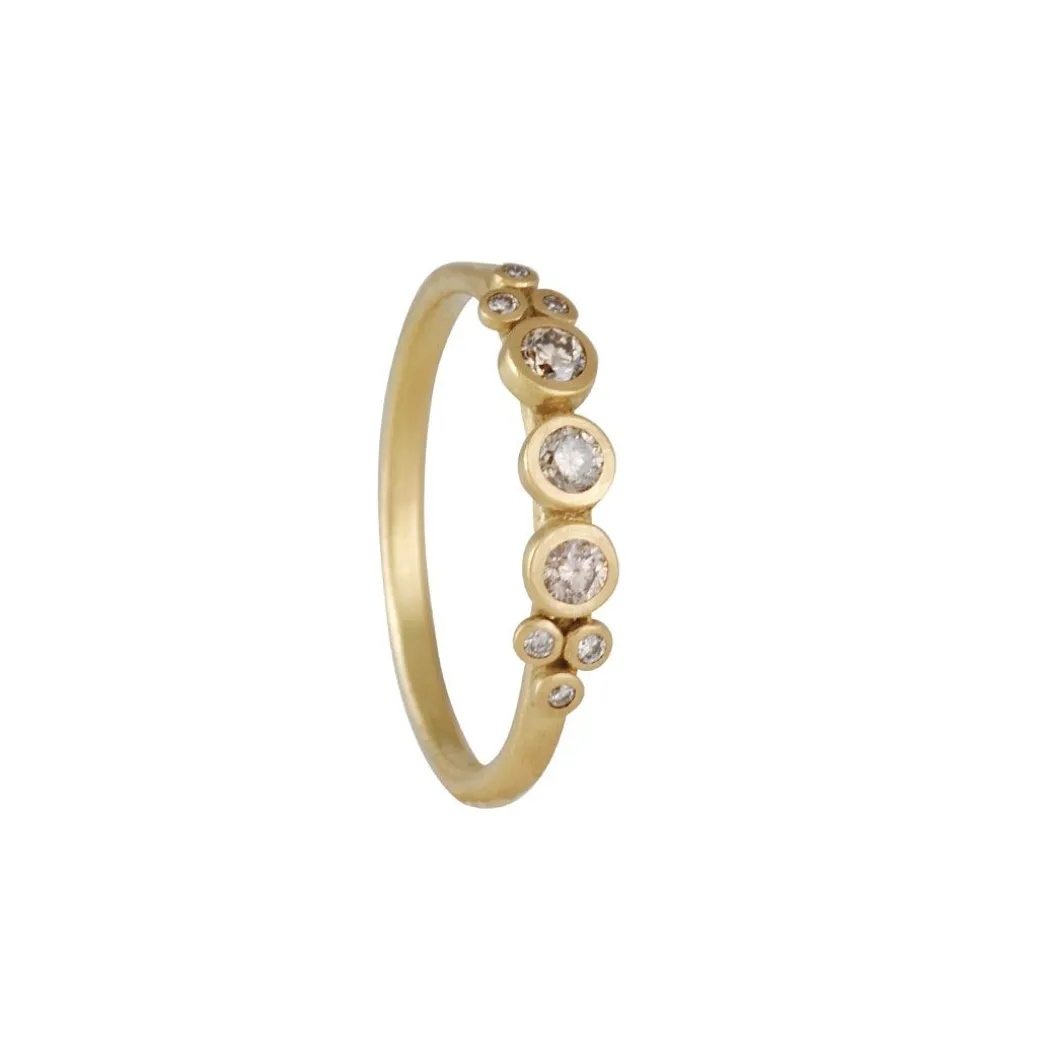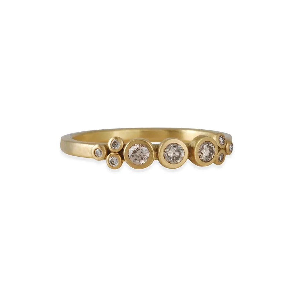 This elegant and romantic ring combines clean geometry with old-school romanticism and can be worn as either an engagement, wedding, or anniversary ring. A row of three bezel-set diamonds in a warm champagne tone is complemented on either side by clusters of tiny champagne diamonds. The stones are set slightly aloft from a lightly hammered band to allow another ring to stack flush beside it. Handmade in Ananda’s Massachusetts studio using ethically sourced stones and recycled gold.