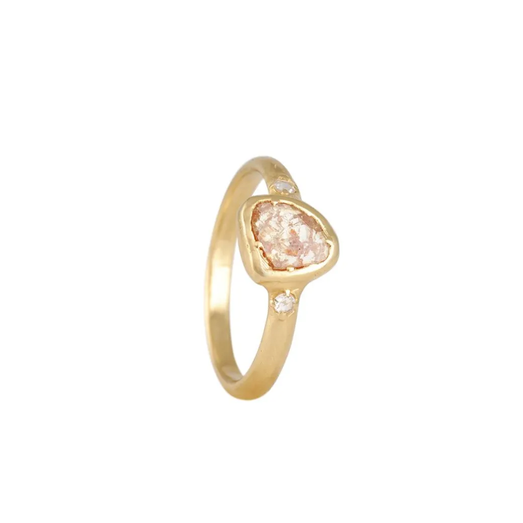This natural and enchanting ring from Atelier Narcé evokes a sense of wonder. An organic rose cut diamond slice is nestled between two delicate yet dazzling diamonds, situated on a 14 karat yellow gold band.