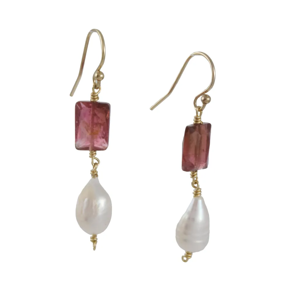 These dangle earring feature a rectangular pink tourmaline with a fresh water pearl drop. Handmade in Brooklyn by former Clay Pot gemologist Danielle Mayes.