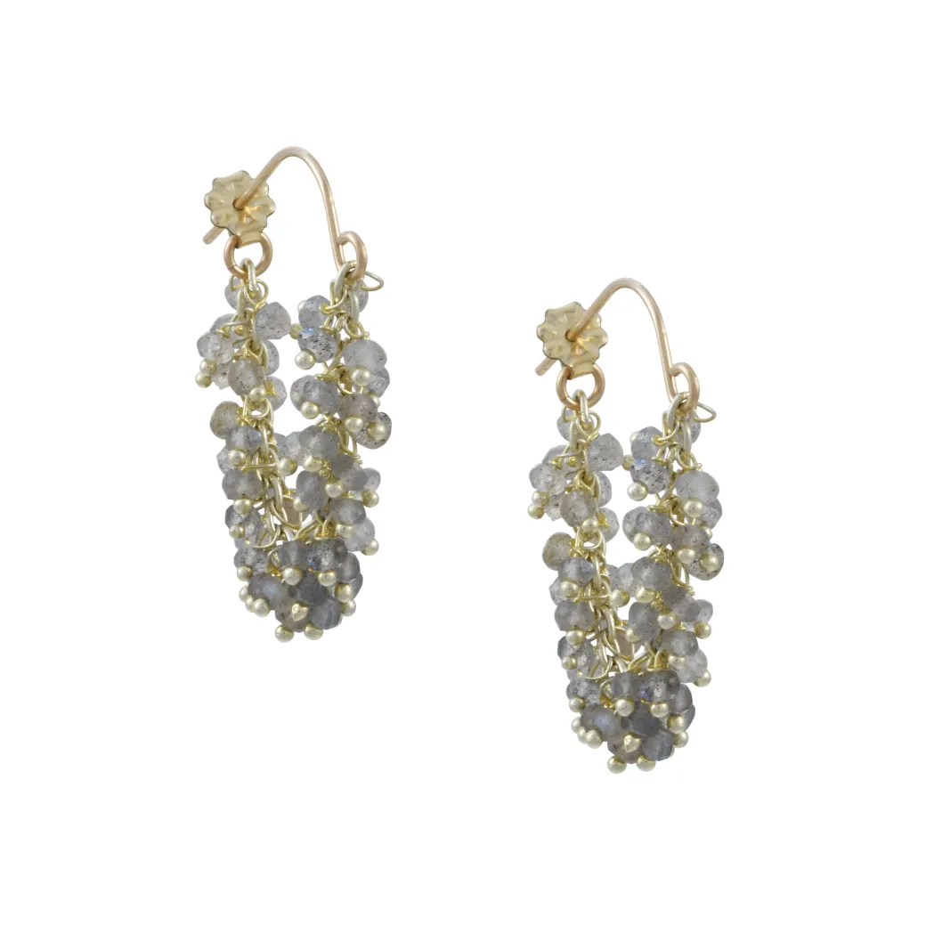 These fringe hoop earrings feature labradorite beads daintily draped from a vermeil chain. Their playful charm effortlessly elevates any outfit.