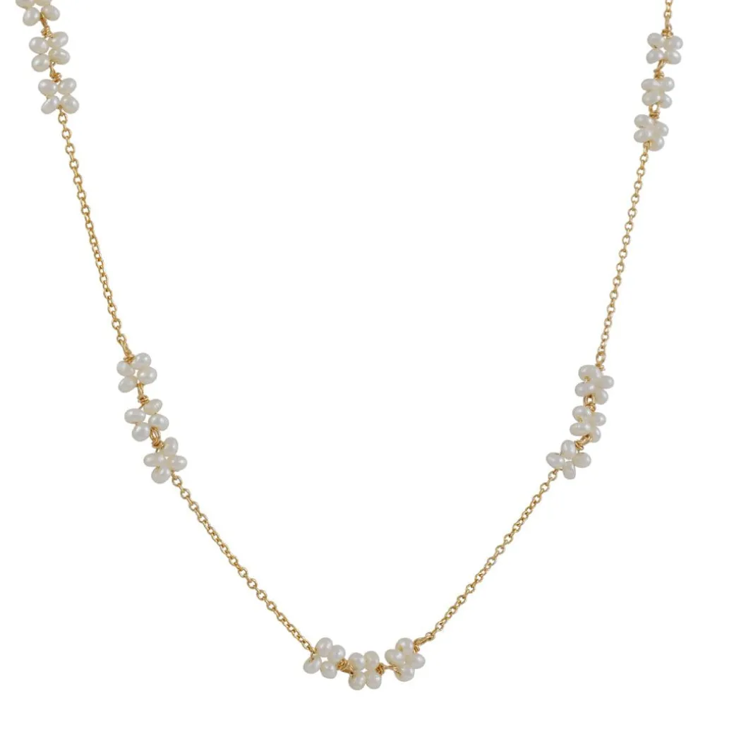 This lovely necklace features goldfill hand wire-wrapped mixed gemstone drops. The the pearls are woven into the delicate cable chain and finished with a simple lobster clasp. Handcrafted in Brooklyn, NY.