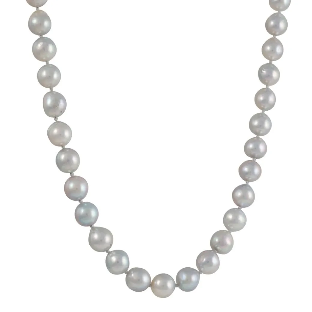 This charming and classic necklace features an array of silvery akoya pearls. The pearls are strung with soft grey cord and finished with a sturdy white gold clasp.