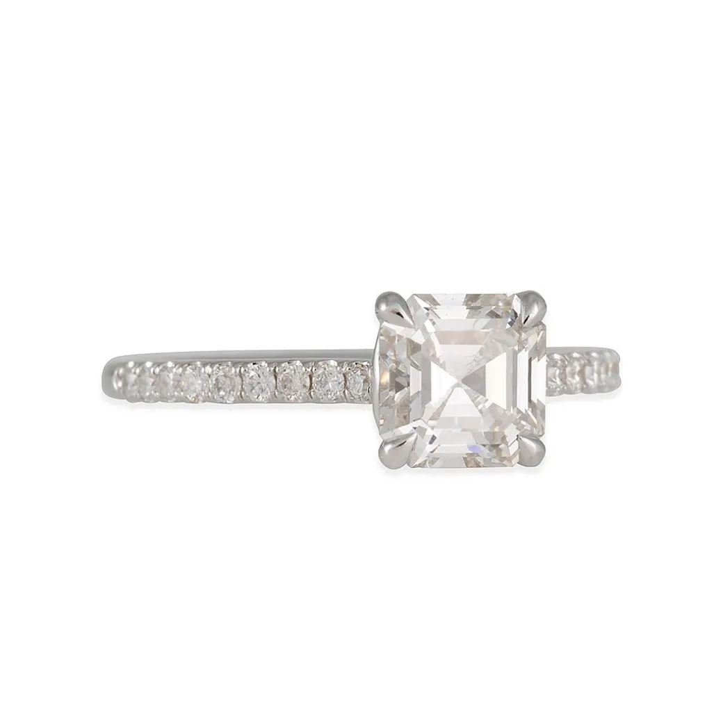 A delicate 1.6 mm round band, set halfway with shimmering diamonds, adds subtle brilliance without distracting from the architectural beauty of the Asscher cut.