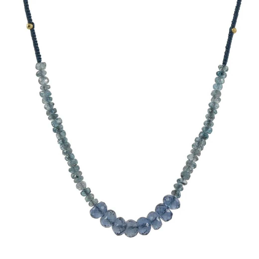 This lovely necklace features Danielle Welmond’s signature crochet technique. London Blue topaz rondelles are woven together in a section and stationed on a braided chain of teal blue silk thread. Handcrafted in Danielle’s California studio.