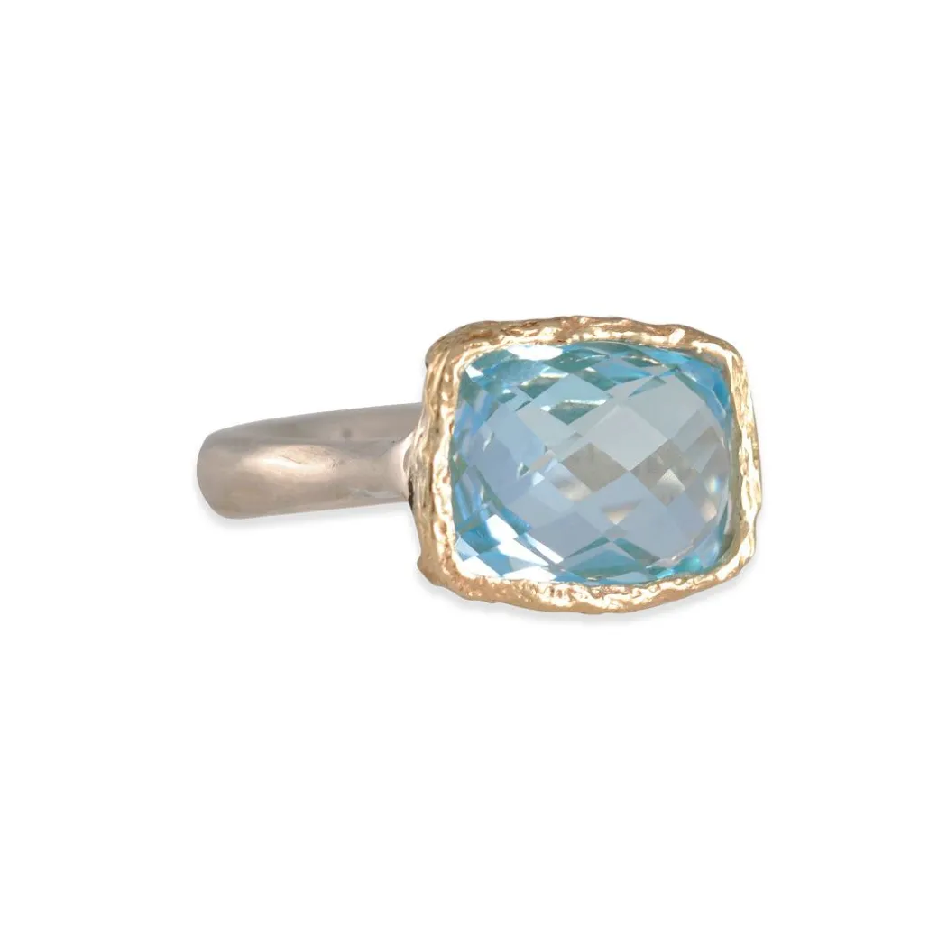 This dazzling ring features a rectangular blue topaz stone enclosed in an organic textured 14 karat yellow gold bezel setting. The blue topaz is raised up by a sterling silver band with slight indented prongs, allowing for the stone to appear floating above and below the setting.