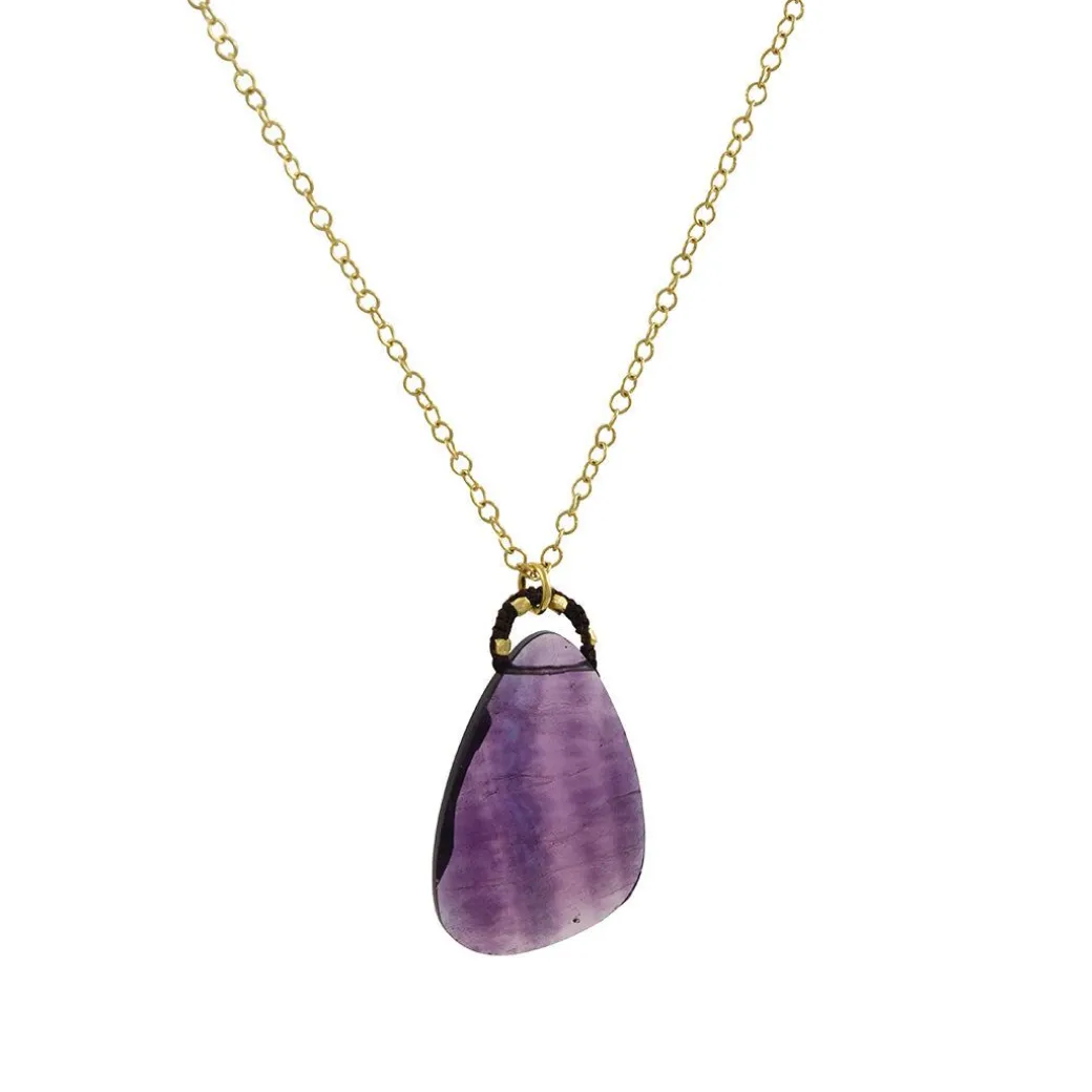 This capitvating striated fluorite is suspended by Danielle’s signature hand crocheted bales strung on a delicate gold fill chain.