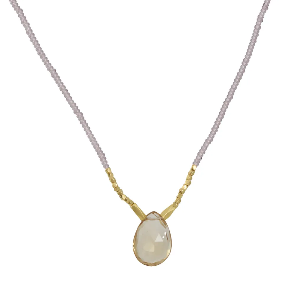 This elegant necklace showcases a teardrop-shaped golden quartz stone suspended from a string of shimmering pink seed beads.