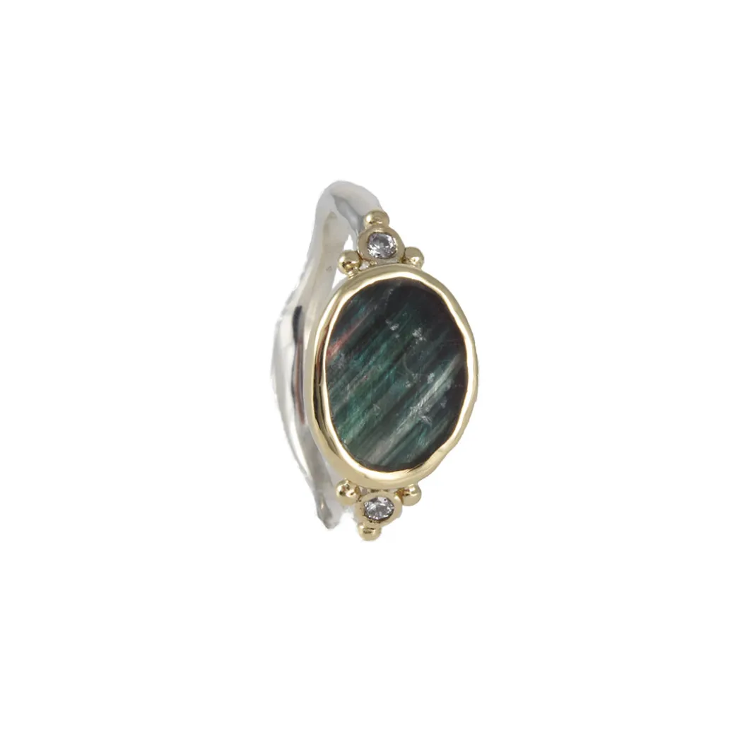 This striped teal andesine is accented by two glistening diamonds. This ring matches depth with sparkle in this elegant design.
