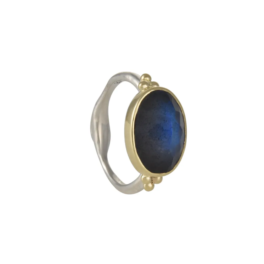 This special ring features a faceted labradorite bezel set in 14k yellow gold. The setting is accented with a trio of gold granulation beads, completed with an organic formed sterling silver band.