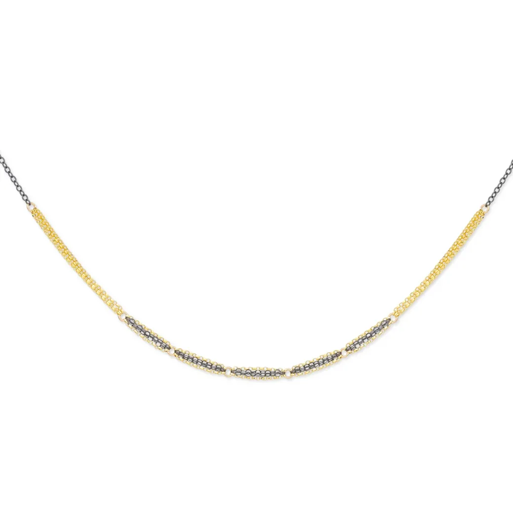 Double-stranded mixed metal necklace showcasing a beautifully patterned chain made from 14K gold-fill and oxidized sterling silver. Layers beautifully with the longer EMA necklace.
