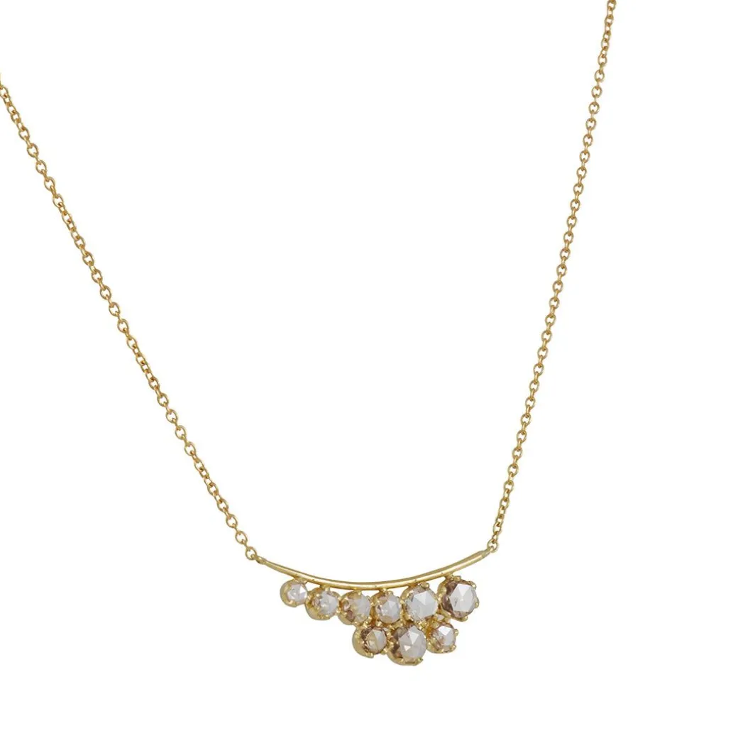 The Nebula Necklace is an elegant study in asymmetry and light. Two rows of rose-cut diamonds shimmer along a gently curved 18k yellow gold bar, their placement creating a soft constellation effect at the collarbone. Handcrafted with Kothari’s signature attention to proportion and detail, this piece balances timeless grace with modern restraint.