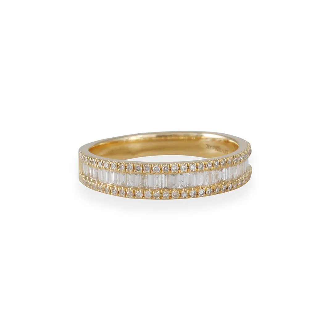 This dazzling ring features baguette white diamonds channel set between two rows of pave white diamonds. They are set halfway around a high polished 14K yellow gold band which tapers slightly towards the palm of your hand.