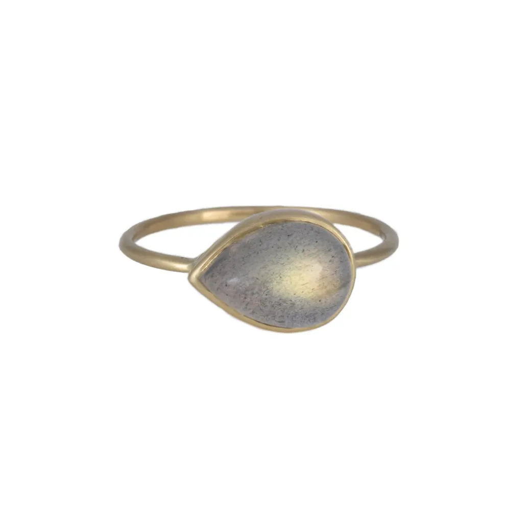 This bold ring has a Teardrop cabochon labradorite with smooth finish, and a nice strong flash of mossy green.