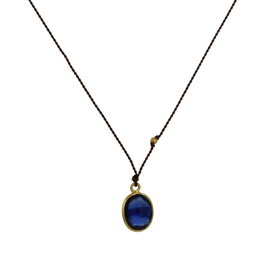 A deep, faceted oval kyanite glows with oceanic blue tones, set in a warm 18K gold bezel and strung on a minimalist brown cord. A single gold bead accent adds a refined finishing touch to this understated design.