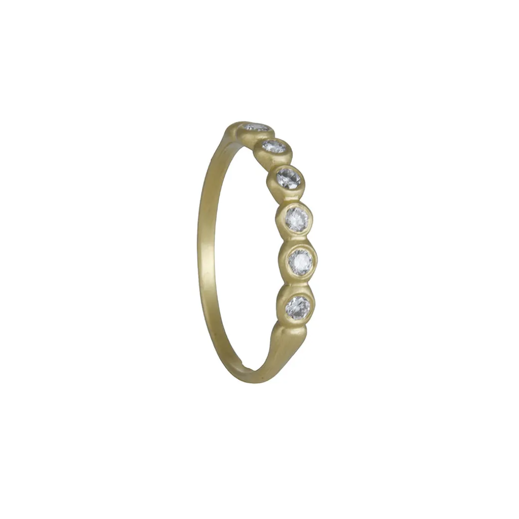 A modern classic with quiet sparkle. The Porch Skimmer Band features a row of seven bezel-set white diamonds in hand-finished 18k yellow gold. Its soft matte surface and low profile make it perfect for stacking, pairing with an engagement ring, or wearing alone for a subtle shimmer. Each piece reflects Marian Maurer’s signature balance of subtle texture and heirloom craftsmanship.