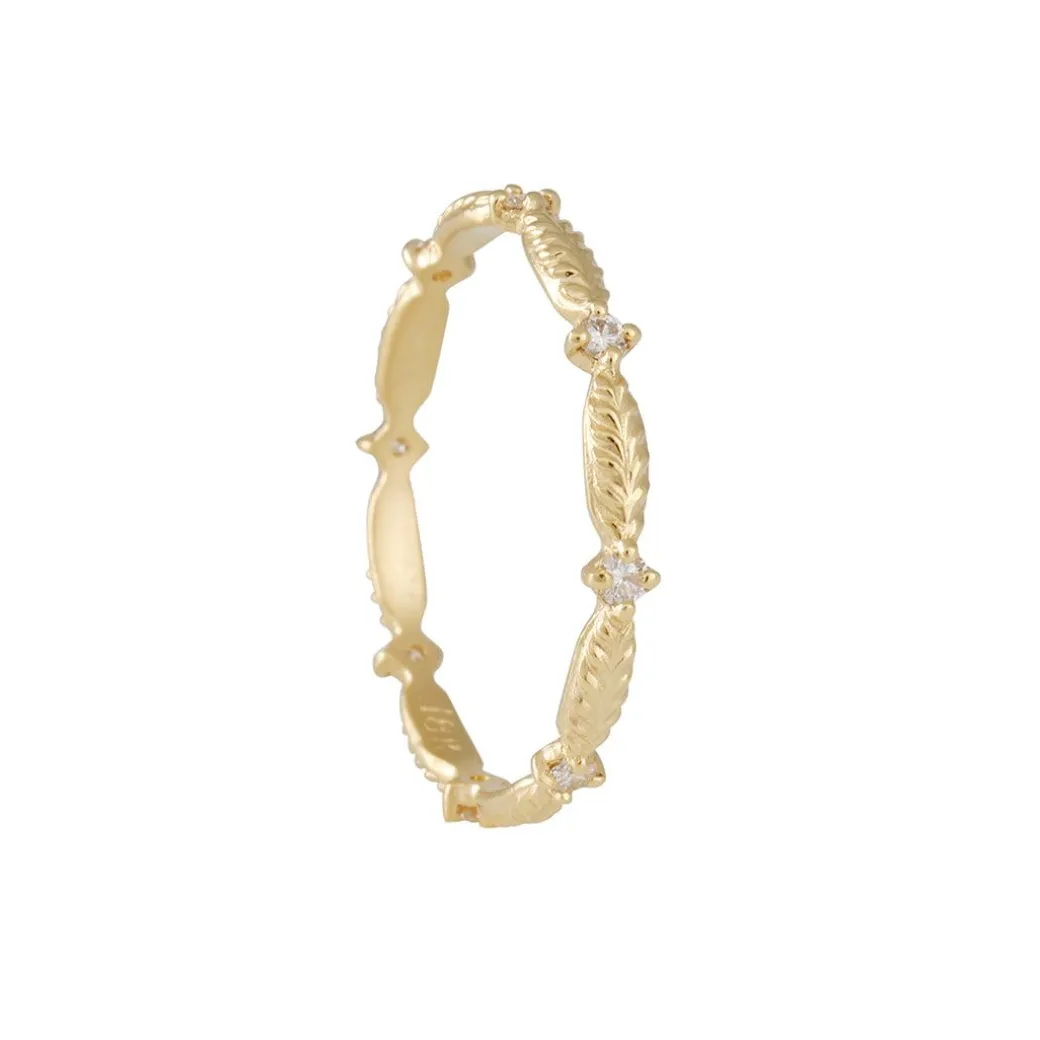 This beautifully made eternity band features tiny shimmering white diamonds prong set within a coniferous motif. The evergreen needles are hand engraved with a subtle matte finish. Handcrafted in Fort Worth, TX by Megan Thorne.