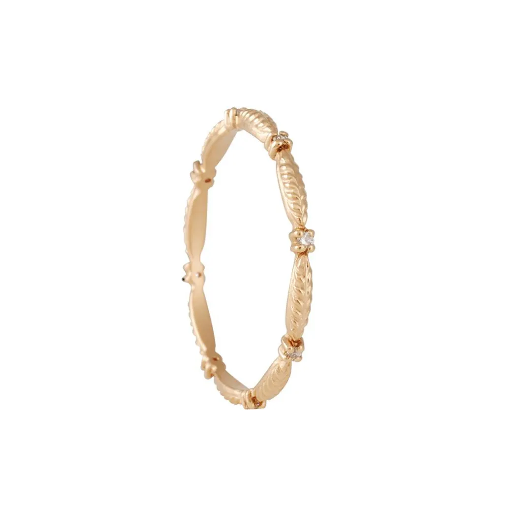 This beautifully made eternity band features tiny shimmering white diamonds prong set within a coniferous motif. The evergreen needles are hand engraved with a subtle matte finish. Handcrafted in Fort Worth, TX by Megan Thorne.