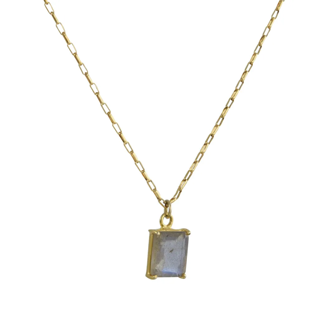 This unusual and tailored necklace features a flashing labradorite in a prong setting. Handmade in Oakland, CA.