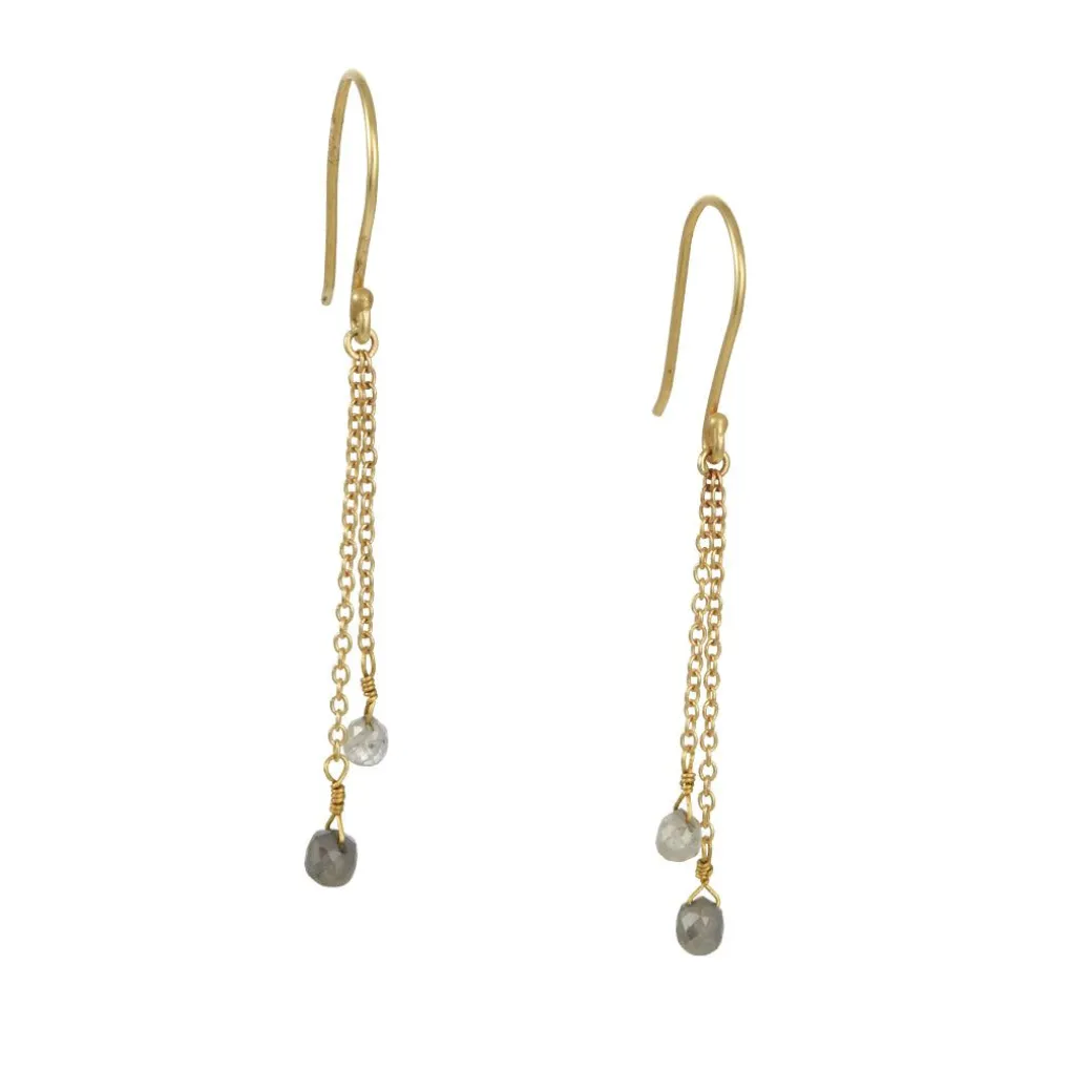 Glamorous grey and white diamond briolettes dangle from chains of gold, sparkling like tiny disco balls.