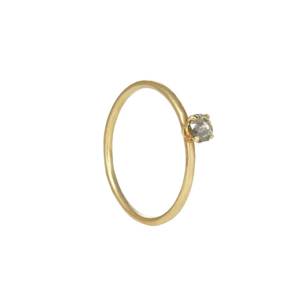 A round brilliant four prong green diamond stacking ring is simple elegant and done absolutely perfectly.