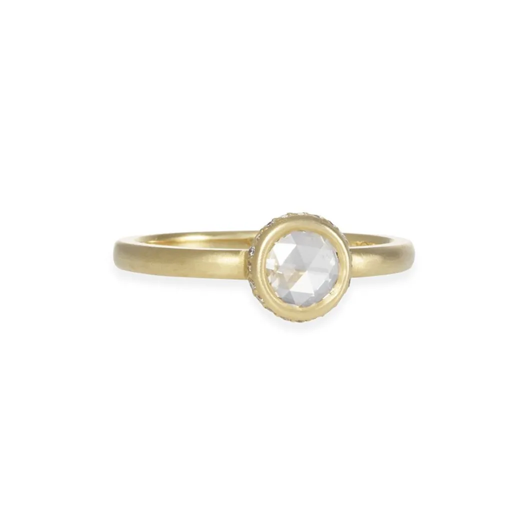 This ring features a rosecut diamond set in a clean, minimalist bezel setting. The side profile reveals all the surprise details of a hidden halo of pavé diamonds and an exposed base of the diamond.