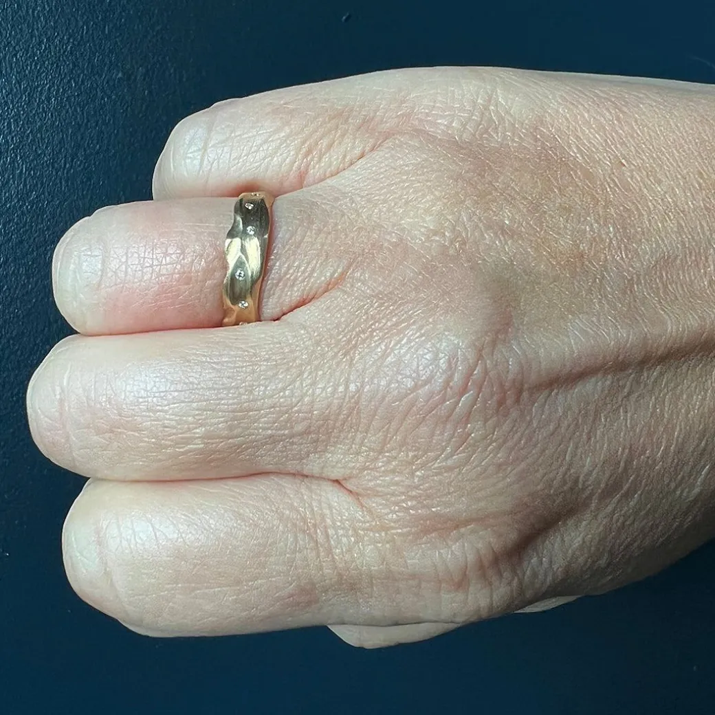The Raging River Band, is reminiscent of canyons patiently carved by rushing water. This version with tiny diamonds set into the flowing stream is especially pretty. Shown here in 14K yellow gold with a subtle matte finish.