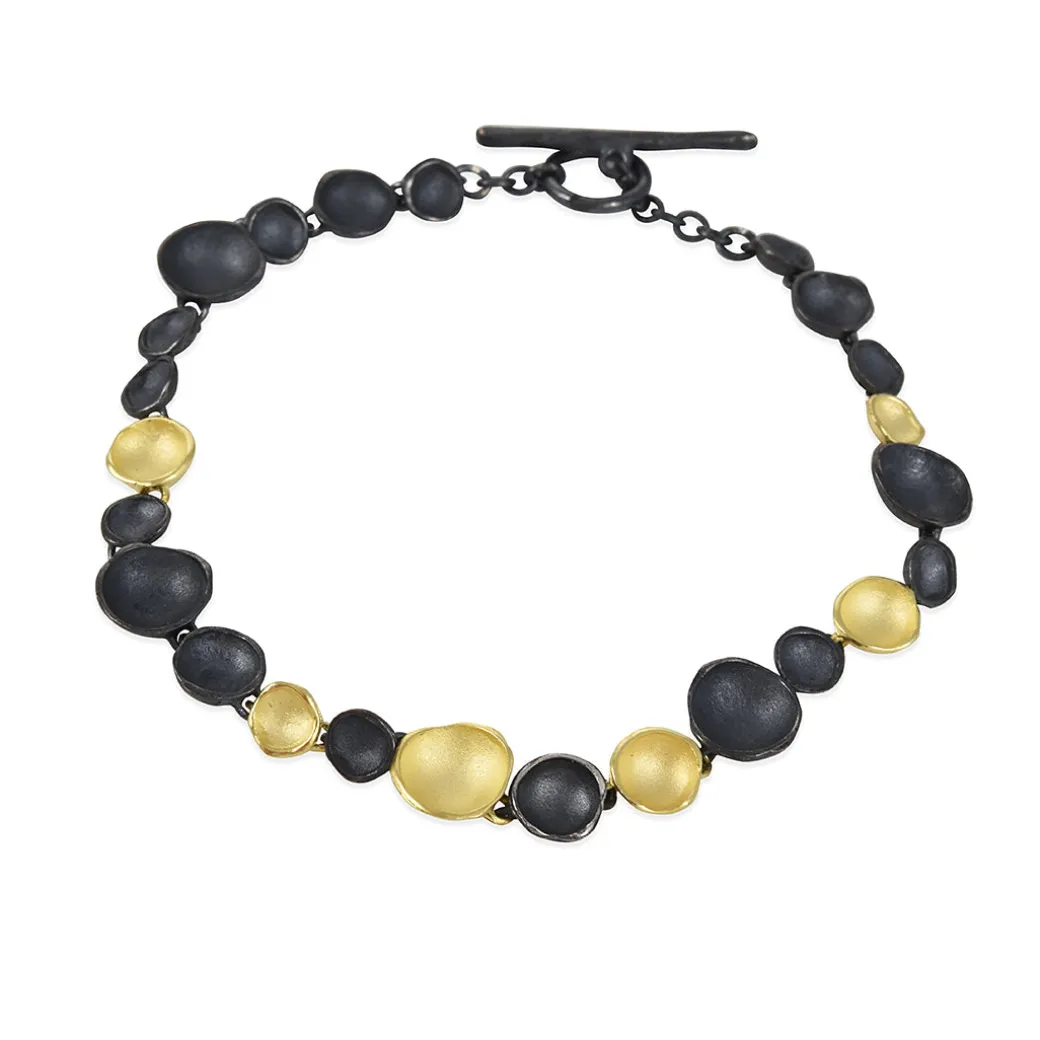 This classic bracelet features Sarah’s signature Pod elements, linked oxidized silver and vermeil. The interior of each pod is finished with a mysterious luster, contrasted by a high-polish rim. Handcrafted in Sarah’s Bay Area studio.