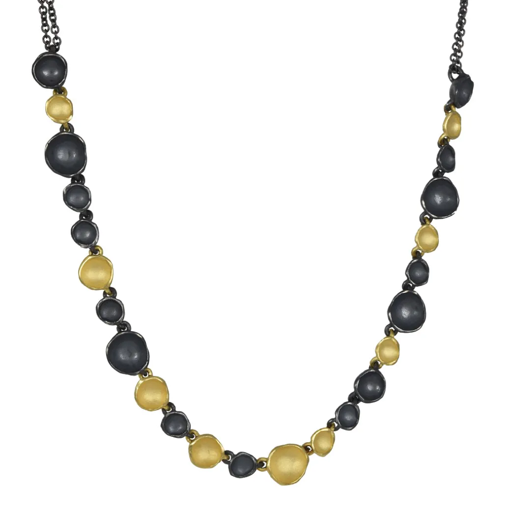 This elegant necklace showcases Sarah Richardson’s signature Pods. Crafted from oxidized silver and vermeil, each pod has a mysterious matte interior, with a high-polished rim. The organic shapes are connected in an alternating pattern and hung on two lengths of sterling silver cable chain. Handcrafted in Sarah’s Bay Area studio.