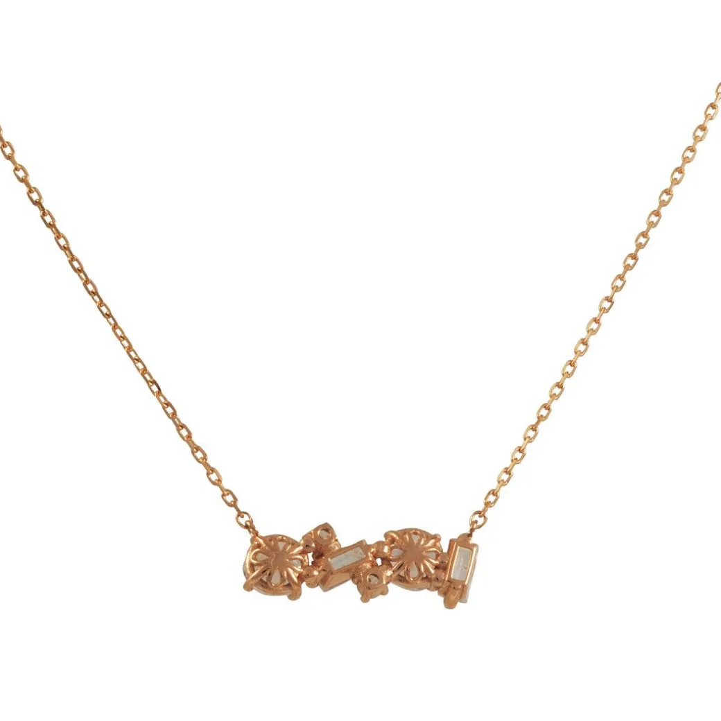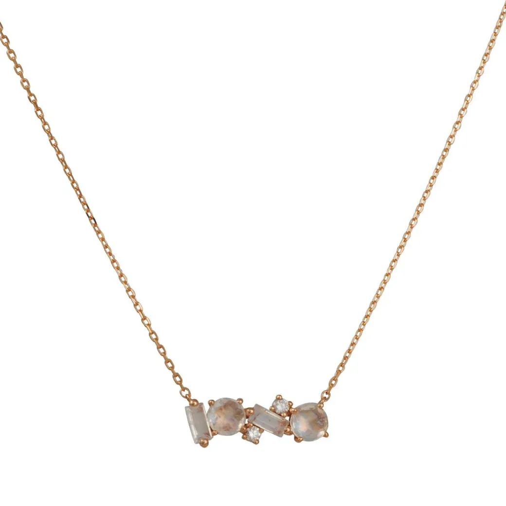This captivating necklace features a mosaic pendant of prong-set white topaz, rose-cut moonstones, and diamonds. Stationed on a sparkling sturdy cable chain. As detail photo shows, the backside features Suzanne’s signature filigree work. Handcrafted in Los Angeles, CA.