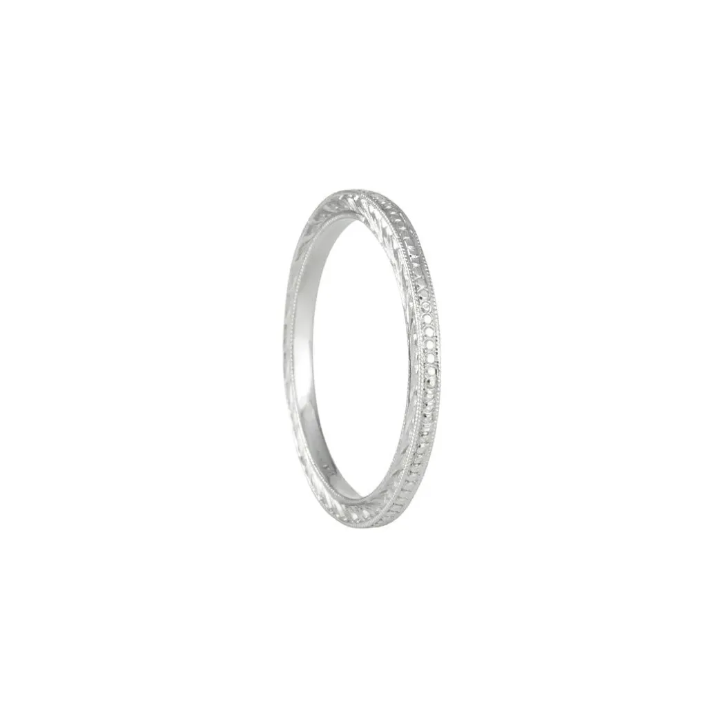 This delicately engraved band showcases Varna’s signature engraving on three sides. This ring plays well with others and can be nicely stacked with eternity bands and many engagement rings. Handcrafted in Los Angeles, CA by family-owned jewelry house, Varna.