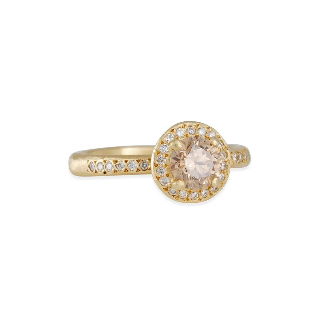 This stunning ring features a center champagne diamond with a pave white diamond halo. It features pave diamonds way around the satin finished band.