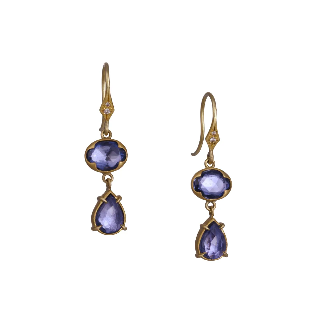 Deep violet sapphires shimmer with dimensional brilliance in this elegant drop design. Each earring pairs a faceted oval sapphire with a pear-shaped sapphire below, accented by a single diamond set into the sculpted 18k gold hook. A refined balance of color and light, these earrings move gracefully with every turn of the head.