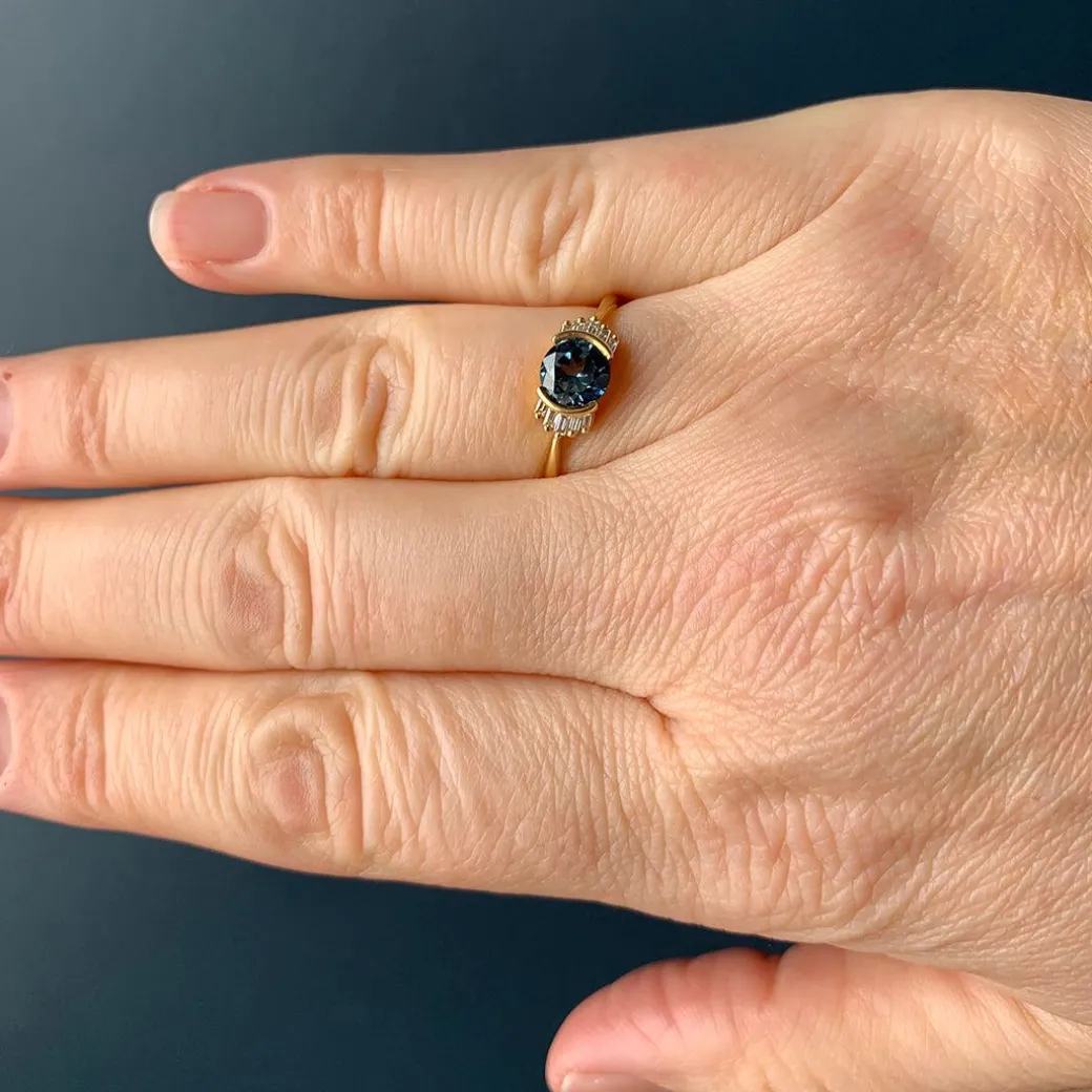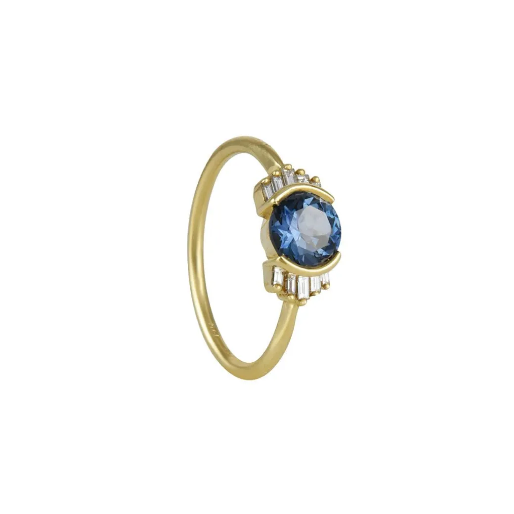This round cut teal sapphire engagement ring with white diamond wings features a breathtaking teal sapphire that is simply captivating. The teal sapphire is flanked on either side by sparkling white diamond needle baguette wings.