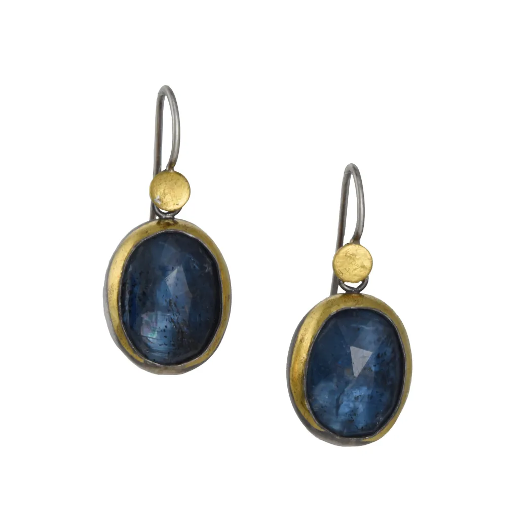 These beautiful earrings feature rose-cut stones are wrapped in oxidized silver with highlights of 24k gold. Hand made in Austin’s Virginia Studio.