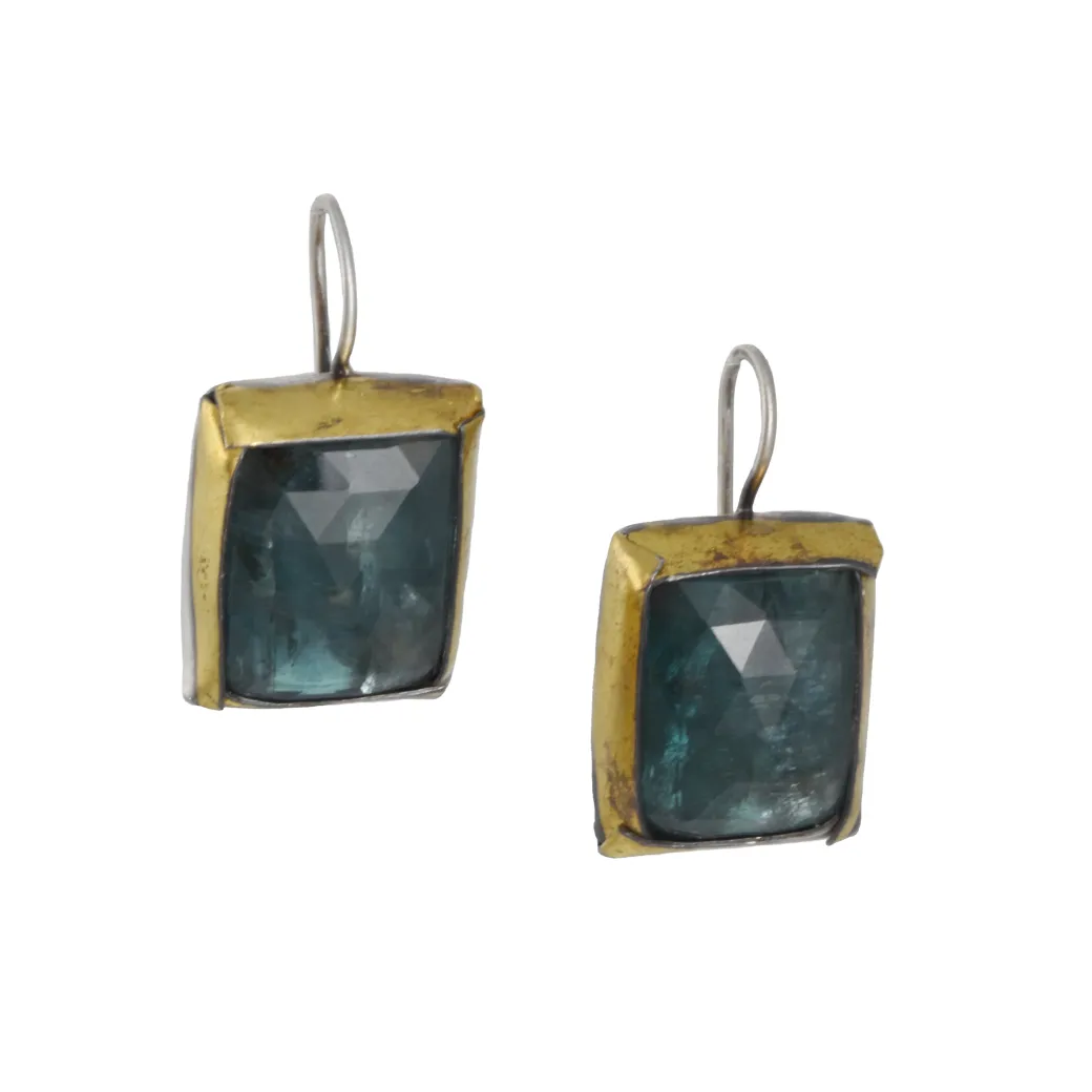These beautiful earrings feature rose-cut stones are wrapped in oxidized silver with highlights of 24k gold. Hand made in Austin’s Virginia Studio.