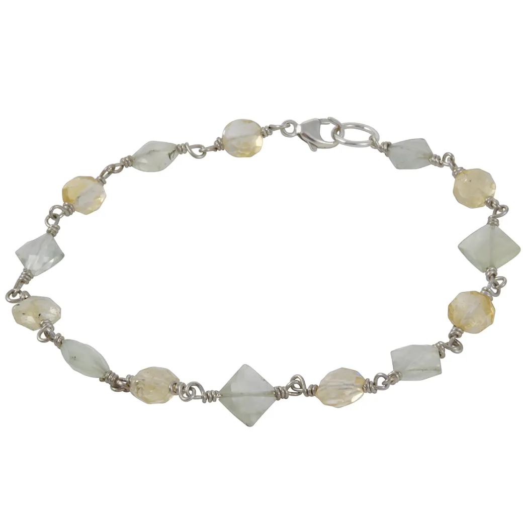 This modern handmade bracelet showcases a delicate weave of sterling silver wiring around a mix of prehnite and citrine gemstones, accentuating their natural beauty. Designed for versatility, it’s perfect to wear alone for a subtle statement or layered in a bracelet stack. Thoughtfully crafted for timeless elegance.