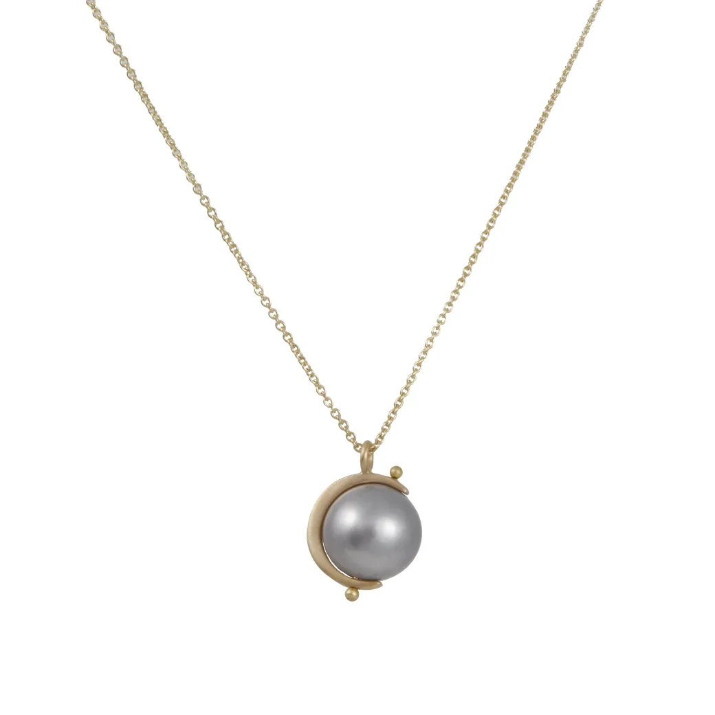 A sliver of a moon cradles a silvery freshwater pearl. The pearl is pinned allowing it to rotate gracefully on its axis. Handmade in Carla Caruso’s Western Mass studio.