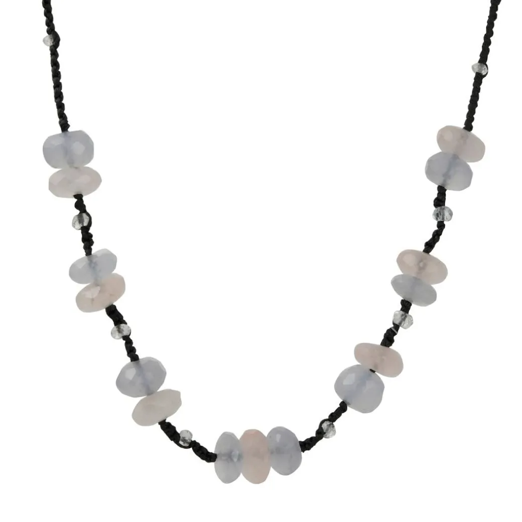 This versatile and springy necklace features organic chalcedony sections accented with smaller rose quartz beads. Stationed on a sturdy leather cord. Handcrafted in Los Angeles, CA.