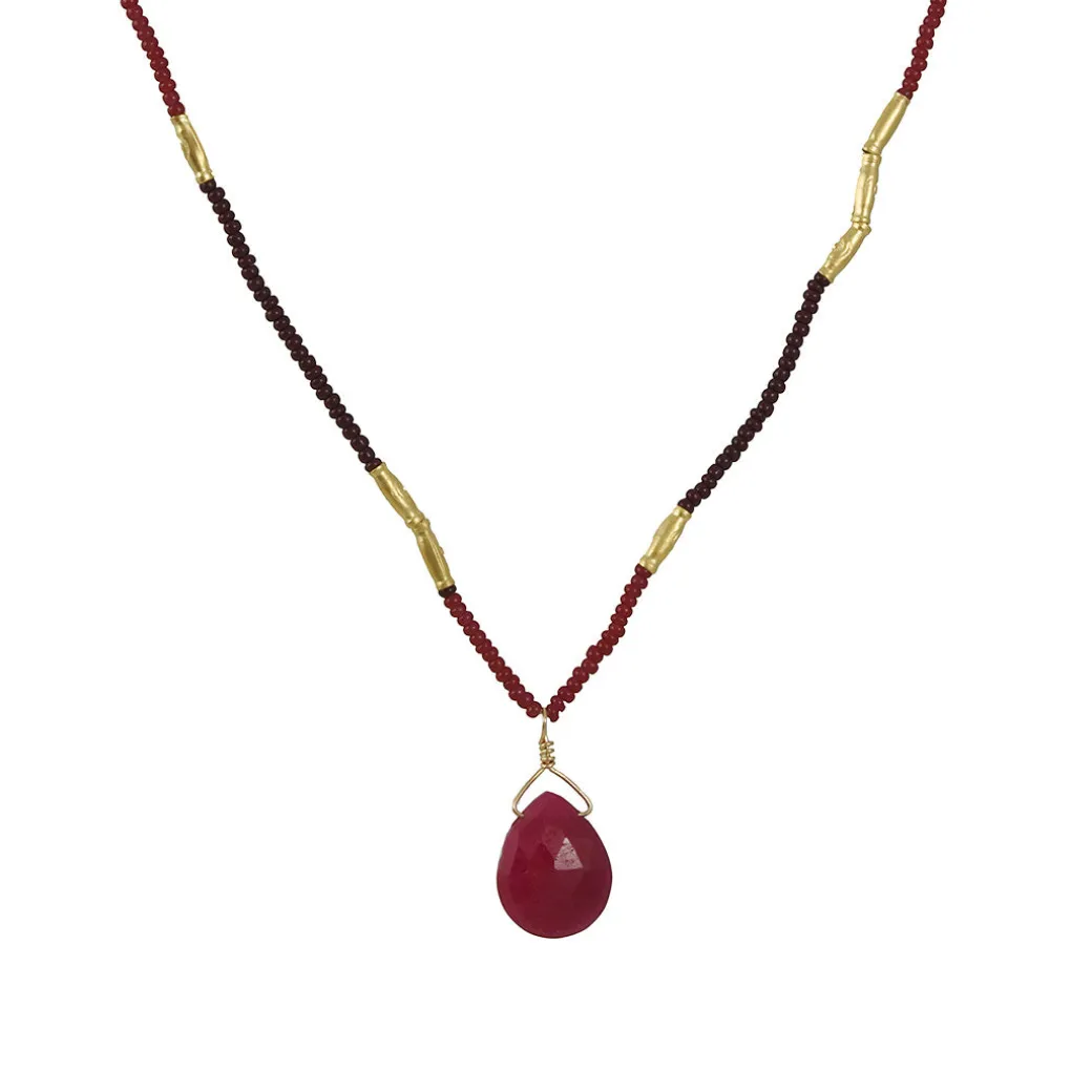 A ruby drop hanging on a strand of deep red garnet and wine colored japanese seed and gold beads is the perfect necklace for any festive occasion.