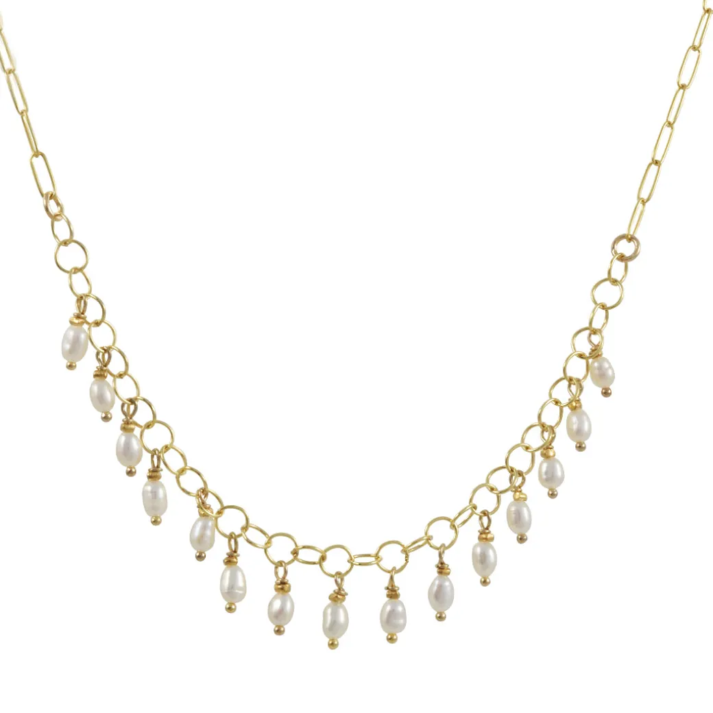 This airy fringe necklace features a cascade of tiny freshwater pearls dangling from an chain of gold-fill links. Handcrafted and created in Austin, Texas.
