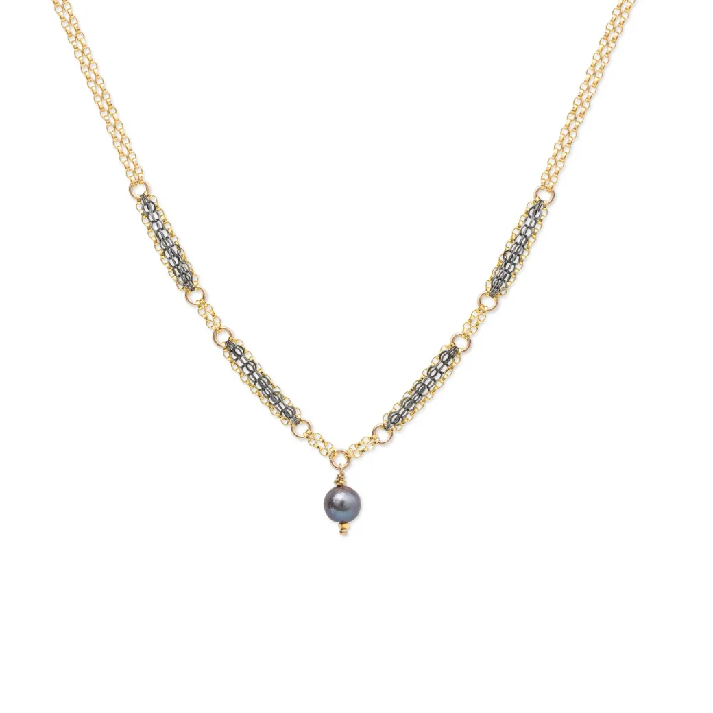 The Marin Necklace blends intricately patterned mixed-metal chains with the luminous beauty of an Akoya pearl. Crafted in 14k gold-fill and oxidized sterling silver, the design pairs warm and dark tones for a striking, modern contrast. A single peacock-grey Akoya pearl drop adds soft iridescence and a refined finish. Lightweight and versatile, it layers effortlessly with Kate’s other pieces while standing beautifully on its own.