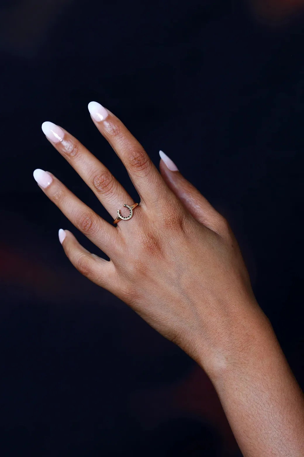 A dainty horseshoe ring with decorative hand cuts and an inner line of black diamonds set subtly inside its arc. Finished with a holographic stippling for soft sparkle — a delicate talisman of luck and light. Put it on and make your own luck.