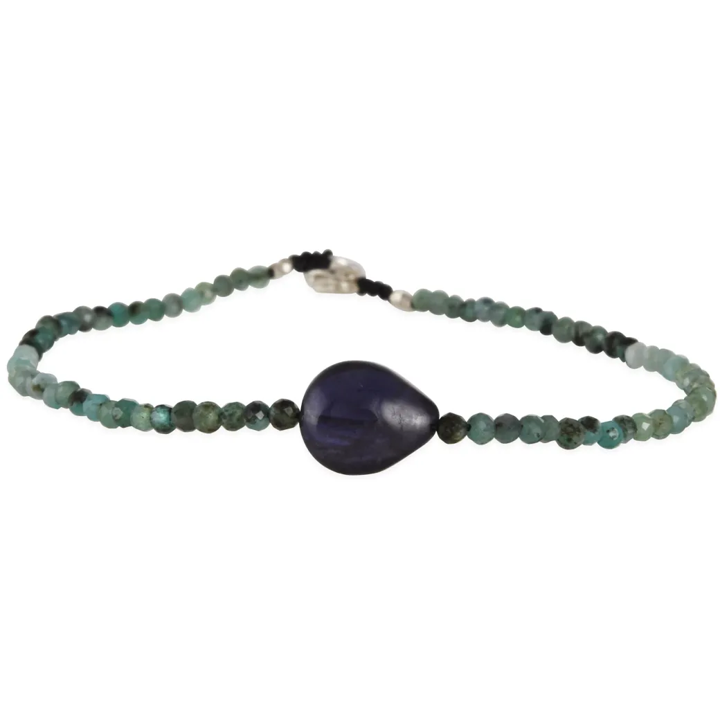 A luminous mix of deep forest and twilight tones, this bracelet pairs faceted emerald beads with a single teardrop iolite centerpiece. The combination evokes calm and quiet strength, perfect for effortless everyday wear. Finished with a sterling silver clasp.