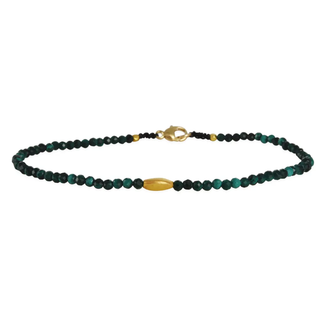 Vivid green malachite beads bring a rich, earthy vibrancy to this delicate bracelet. Centered with a smooth 18k gold oval bead, the strand feels both grounded and refined — a quiet pop of color that layers beautifully with your everyday stack. Hand-strung on durable nylon cord for effortless wear.