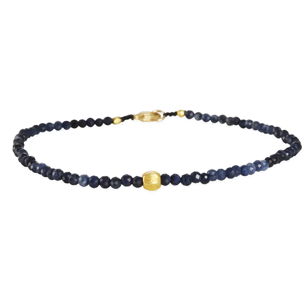 Deep navy and midnight-blue sapphire beads create a strand with a quiet, natural brilliance. A hand-shaped 18k gold bead adds a warm focal point, enhancing the bracelet’s refined simplicity. Hand-strung on durable nylon cord, it offers an easy, everyday elegance that layers beautifully.
