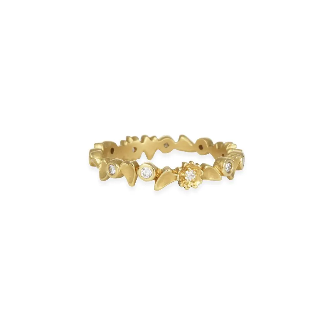 This sweetest golden floral garland band will encircle your finger with bezel set dewdrop diamonds.