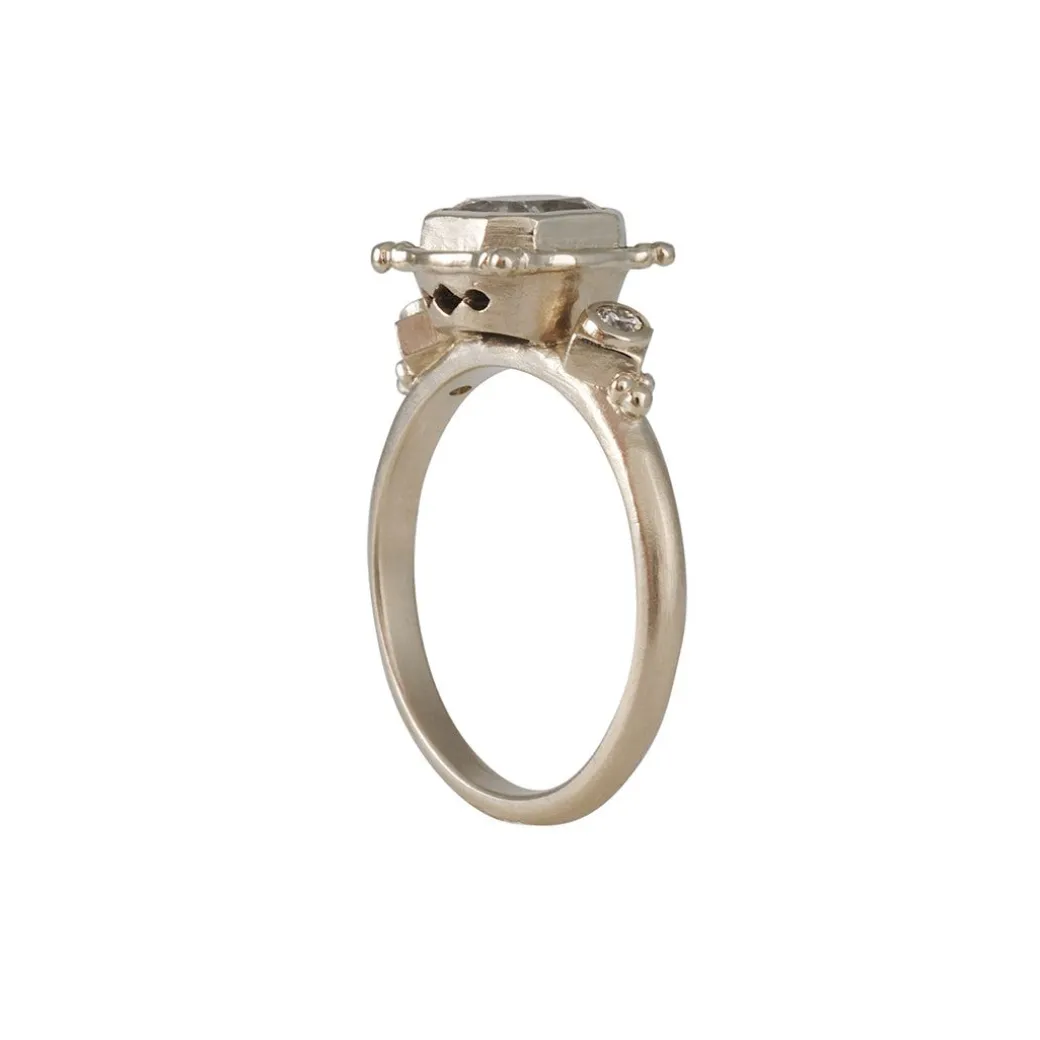 The Picture Frame Ring, by Megan Thorne, was inspired by a toy ring given to the artist when she was a child by her grandmother. This ring style has been recreated with different stone and metal combinations and can be custom made to your specifications. Two small white diamond accent the sides along with polished lacy details. Handcrafted in Ft. Worth, TX studio.